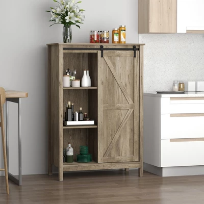HOMCOM Accent Cabinet, Kictchen Cupboard Storage Cabinet, 3-Tier Organizer With Barn Door And Adjustable Shelf