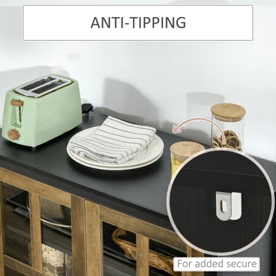 HOMCOM Kitchen Sideboard, Glass Door Buffet Cabinet, Accent Cupboard With Adjustable Storage Shelf For Living Room, Black Wood Grain