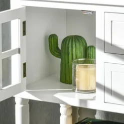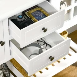- STORAGE SOLUTION: It features a large countertop, two drawers, cabinets with glass doors in a cross pattern, and a slatted bottom shelf. This narrow entryway table provides a spacious storage room for your items. The magnetic door design allows you to don’t need to worry that the door does not close tightly.